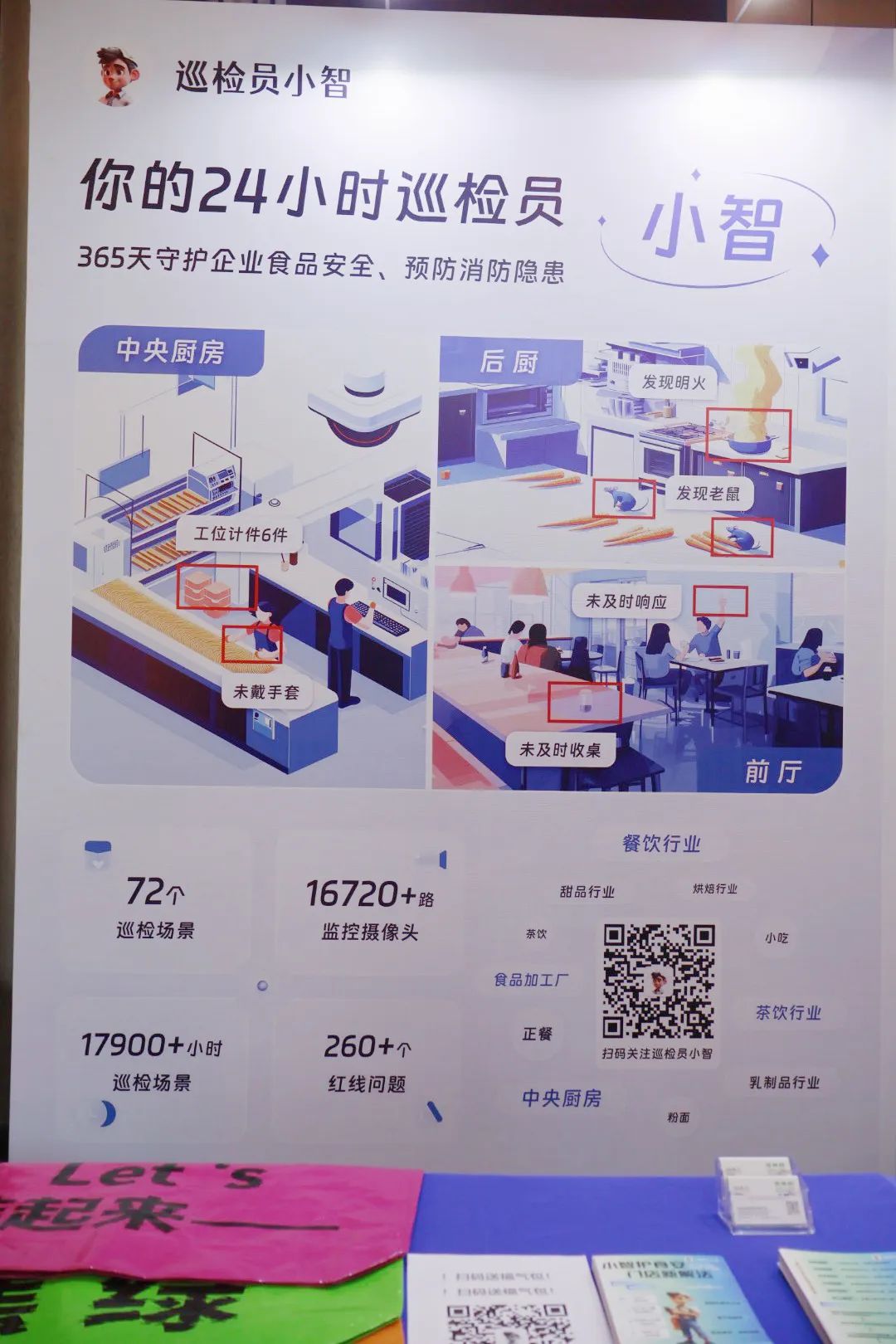 巡检员小智带着 AI 巡检解决方案亮相新技术体验区,围绕近期315食安问题,小智为嘉宾们提供食安隐患破局利器,通过小智的算法接入门店摄像头,为餐饮门店构建“事前预警-事中控制-事后追溯”全链路防线。