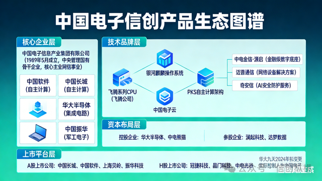 旗下核心子公司与产品品牌特色鲜明。中国软件、中国长城、华大半导体、中国振华等为二级核心子公司,分别聚焦自主计算、集成电路、军工电子等板块;飞腾公司研发的飞腾系列CPU,与银河麒麟操作系统、中国电子云构成“PKS”自主计算架构,是信创领域核心品牌。另有中电金信推出金融级数字底座“源启”,迈普通信深耕网络设备解决方案,奇安信提供AI安全防护服务,形成多元技术品牌矩阵。控股参股企业布局广泛,控股华大半导体、中电熊猫等平台型企业,参股澜起科技、达梦数据等行业标杆。上市公司达16家,涵盖A、H股市场:A股包括中国长城、中国软件、上海贝岭、振华科技等;港股有冠捷科技、晶门科技、中电光谷等。这些上市公司多通过二级子公司管控,华大九天2024年拟变更实际控制人为中国电子,进一步完善芯片产业链上市布局,整体形成“核心子公司筑基、上市平台赋能”的产业生态。