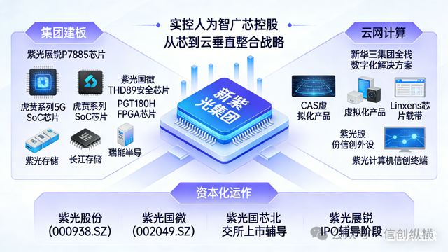 2022年完成破产重整并更名设立的新紫光集团,实控人为智广芯控股,聚焦集成电路与云网计算核心领域,以“从芯到云”垂直整合战略为引领,全力构建自主可控的信创生态,现已成为数字基础设施建设的骨干力量。