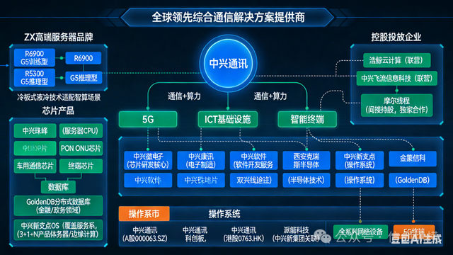 上市公司方面,中兴通讯自身在A股(000063.SZ)、港股(0763.HK)上市,中兴新集团旗下派能科技(科创板)为其关联上市企业。信创及核心产品体系完善,ZX是中兴通讯的高端服务器品牌,涵盖R6900 G5训练型、R5300 G5推理型服务器,配套冷板式液冷技术,适配智算场景。芯片领域由中兴微电子主导,产品覆盖ICT全产业链,含服务器CPU芯片中兴珠峰、PON ONU芯片、车用通信芯片及终端芯片,保障主航道技术自主。数据库为GoldenDB分布式数据库,适配金融、政务等关键领域;操作系统是中兴新支点OS,构建“3+1+N”产品体系,覆盖服务器、边缘计算等多场景。
