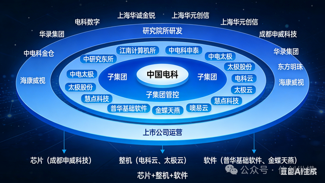 中国电科集团控股参股的企业布局完善,2023年重组控股华录集团,与东方明珠合资成立中电科东珠布局信息基础设施,拥有19家涵盖A、H、B股的上市公司,其中海康威视市值超3000亿元。目前已形成“研究院所研发、子集团管控、上市公司运营”的生态模式,打通“芯片+整机+软件”全链条,为国家信创产业高质量发展提供坚实支撑。