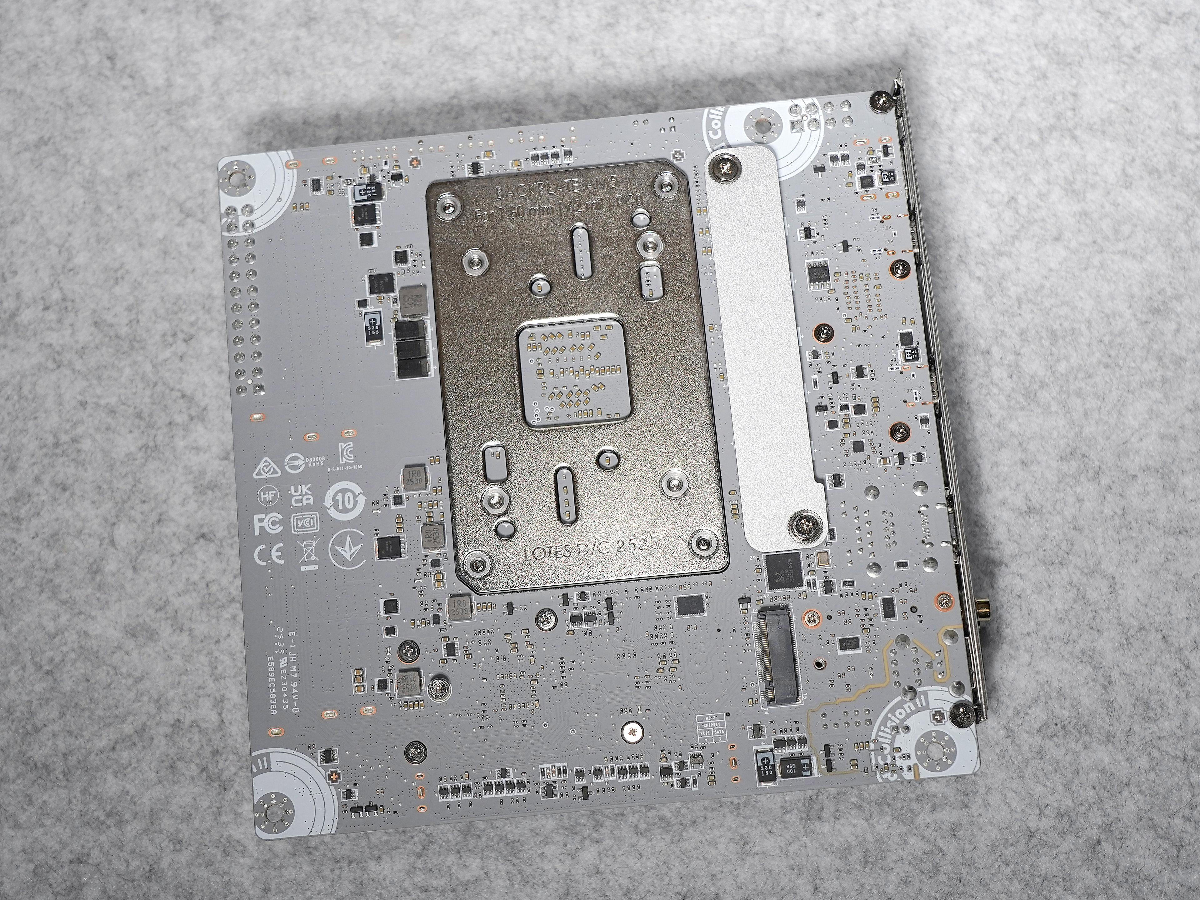 ▼第三个M2接口在PCB背面, 规格为PCIe 4.0 x 4(芯片组提供)。可以看到PCB背面也涂装了银灰色,虽然没提供背板,不过为背面供电区域配备了1个散热片。