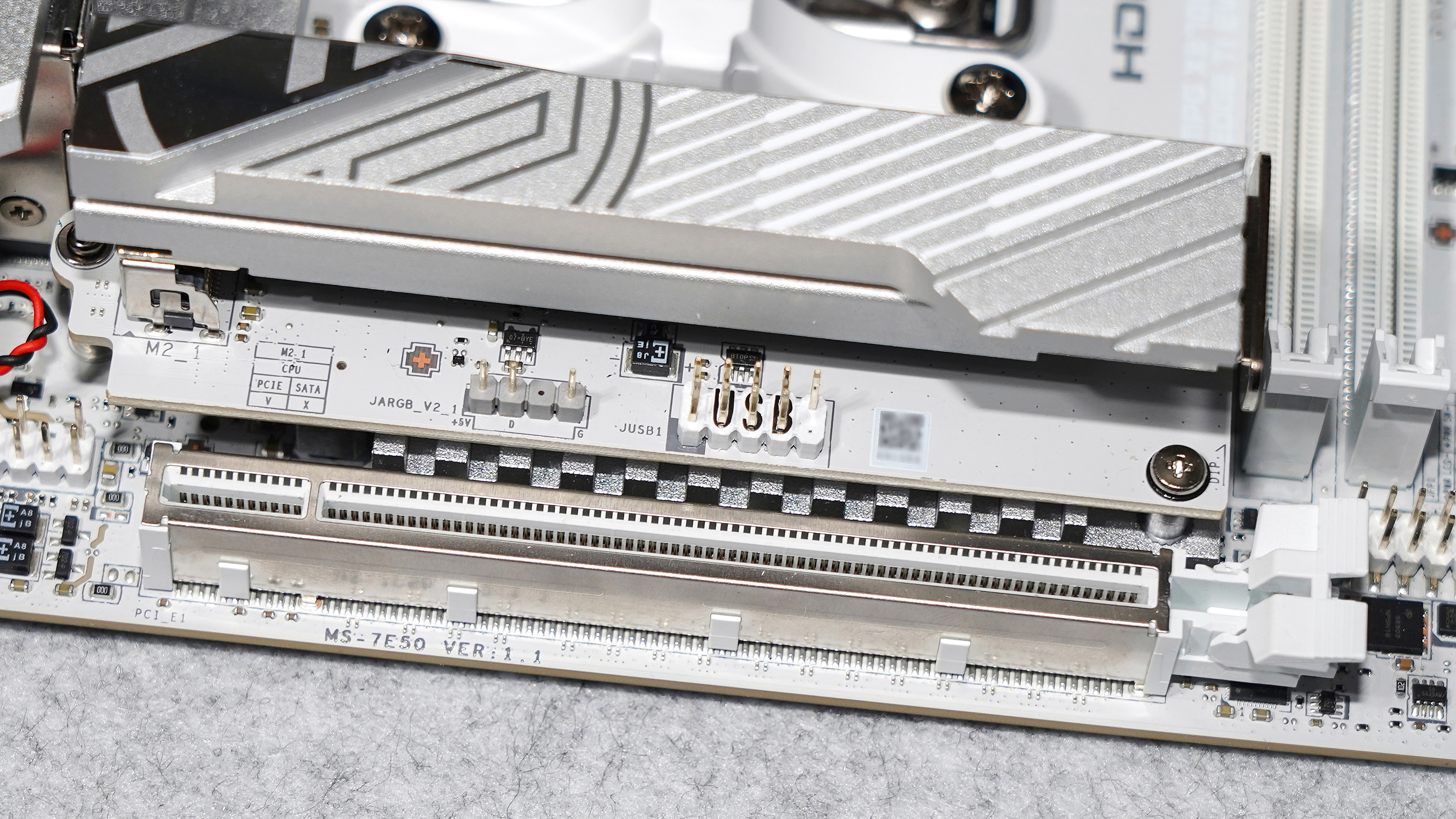 ▼新主板到手会发现SSD散热片有点斜,不要紧的,安装好SSD后就水平了!
