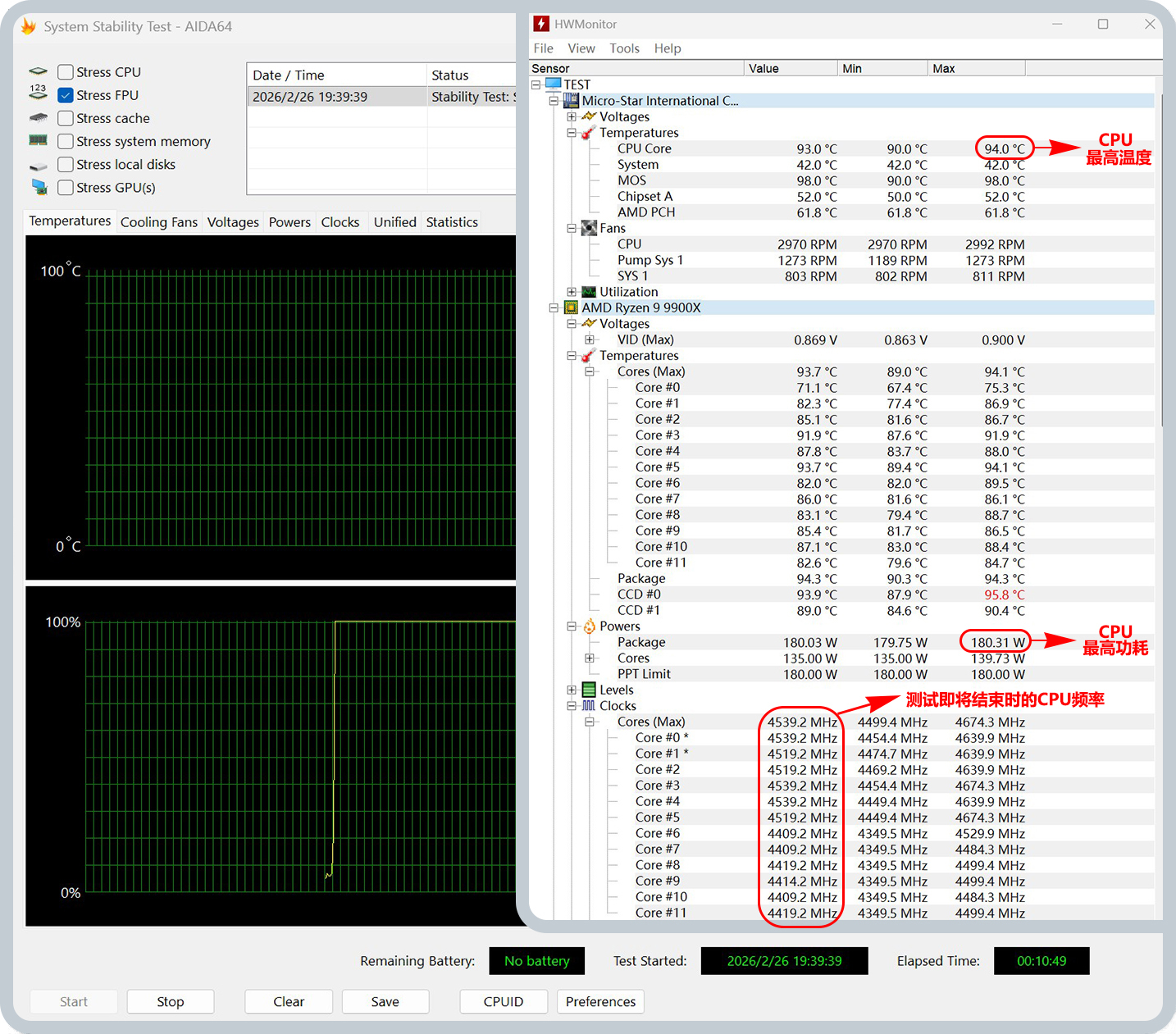▼190w还是无法进行FPU烤机,于是降低到180w,CPU频率能稳定在~4.5Hz,CPU最高温度为94°C,也基本是极限了,一个CCD温度超过了95°C,出现了红字!