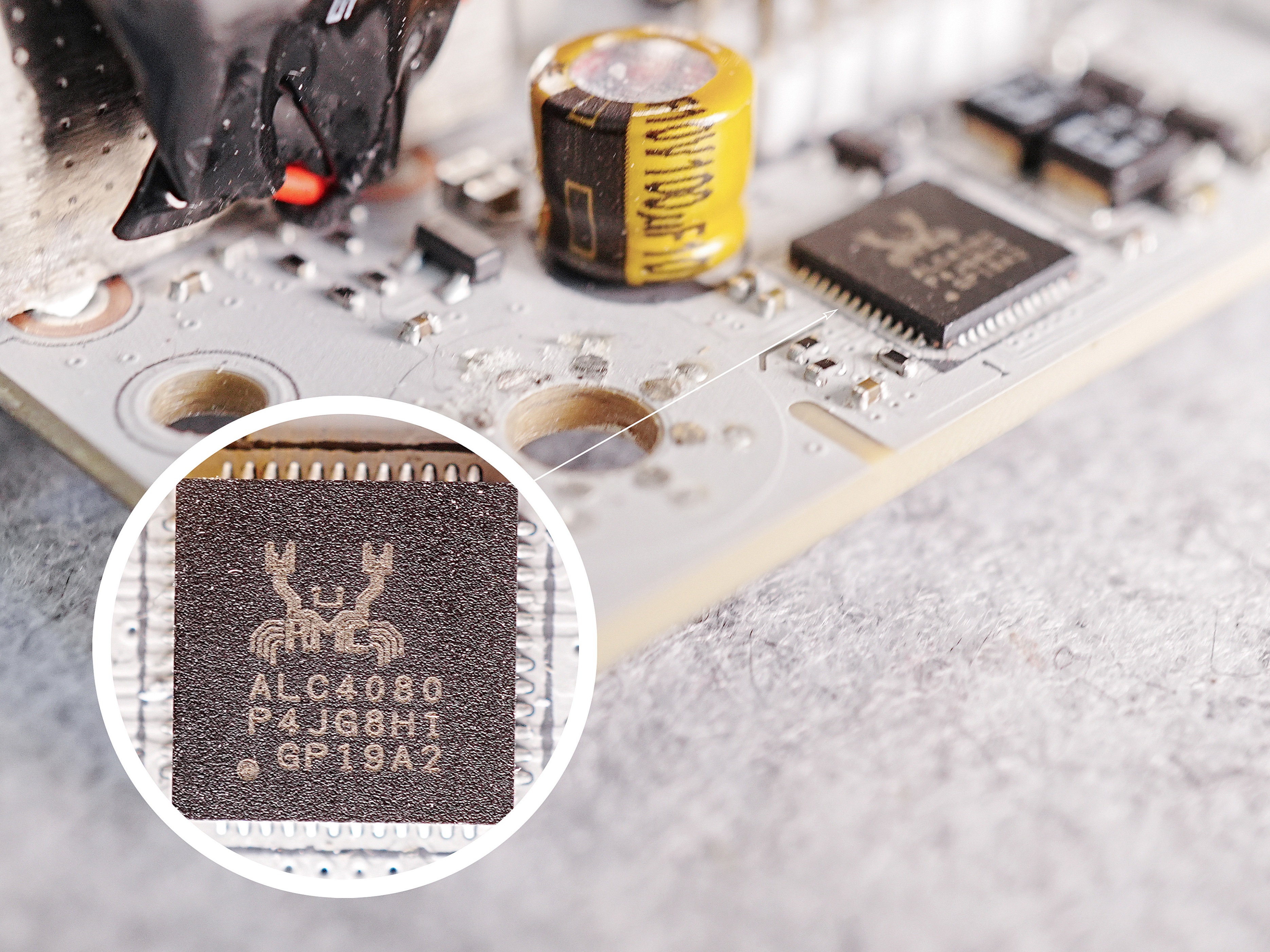▼音频方面,声卡芯片为瑞昱ALC4080,配备有一枚尼吉康10V 100μF的金色滤波电容。