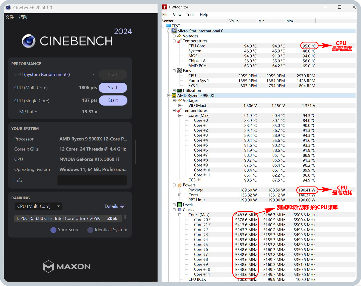 ▼CineBench R24测试到最后,CPU频率在~5.4GHz,CPU最高温度为95°C,在温度墙的边缘游走,不过最终还是没有出现超过95°C的红字,多核跑分没有降低,反而增加了一丢丢。所以适当的限制下PBO后的功耗,可以得到更理想的状态。