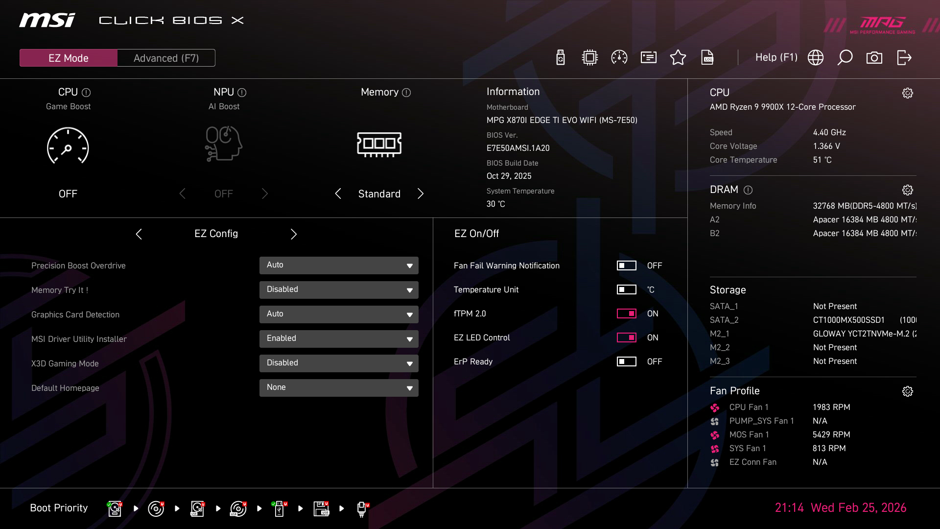 ▼BIOS全部是图形化的设计,风格也是MPG 系列的。在简易界面下(EZ Mode)就可以直接选择PBO的各种策略,以及内存的XMP,Memory Try it(内存超频)等等,还是比较方便的。
