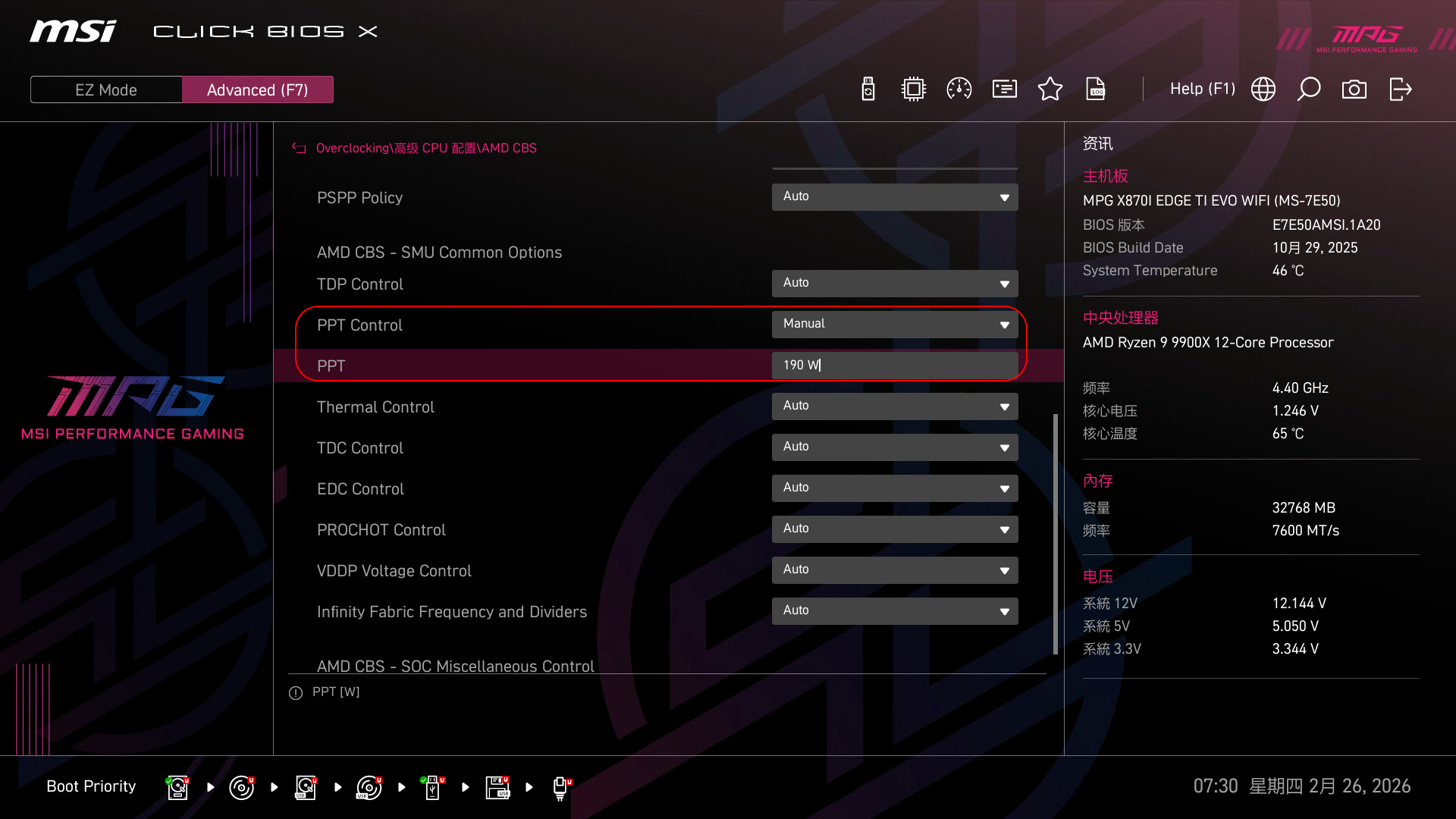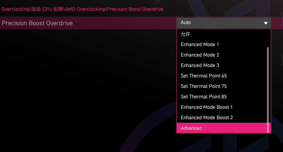 ▼微星主板提供了多种PBO策略,这里使用Advanced模式来进行测试。