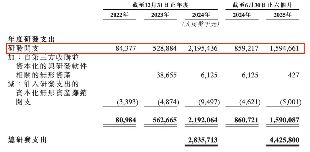 2022 年2025 年上半年,研发费用分别为 8438 万、5.29 亿、21.95 亿,15.95 亿。