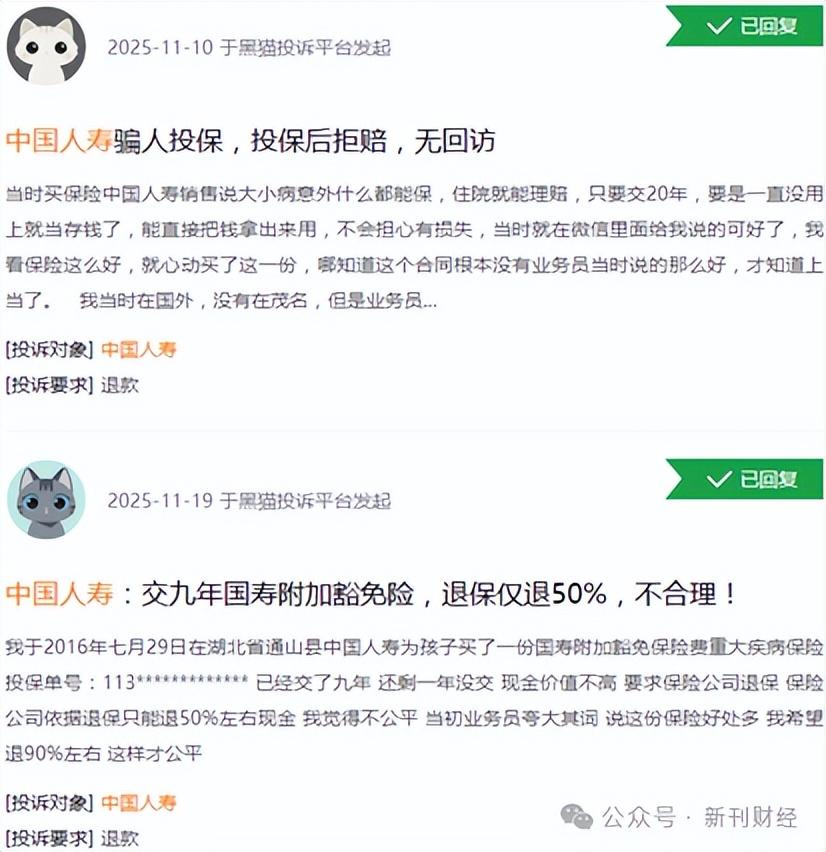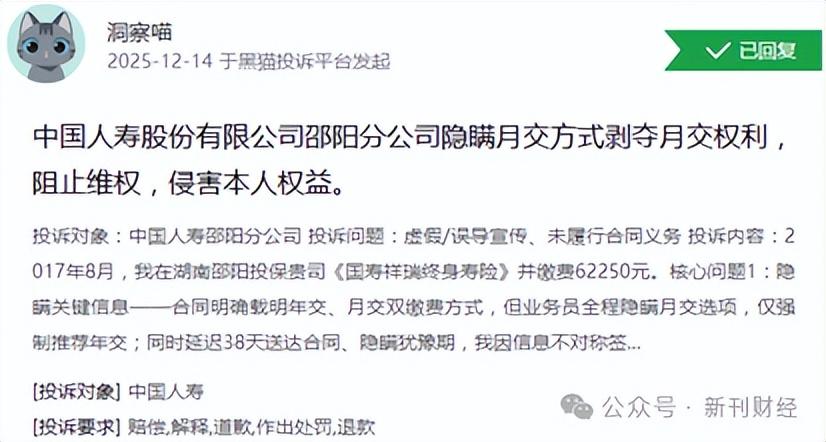 合规问题多发,对中国人寿的长期发展带来了潜在风险。不仅监管处罚使其面临更高的合规成本,也会降低消费者信任,导致客户流失和市场份额下降。中国人寿不仅多次入选《财富》世界500强,2025年更位居中国险企榜首。在世界品牌实验室发布的“中国500最具价值品牌”榜单中,中国人寿品牌价值高达5019亿元,连续多年蝉联行业第一。但今年12月,中国人寿邵阳分公司却因涉嫌通过隐瞒方式剥夺消费者知情权与自主选择权,在黑猫平台再次遭遇消费者投诉。隐瞒重要条款致侵权纠纷消费者自认受欺诈提三倍赔偿根据消费者在上述投诉中的单方面陈述,核心问题直指三大违规行为。其一,销售人员隐瞒关键缴费信息:其在2017年8月投保《国寿祥瑞终身寿险》时,合同明确载明年交、月交双选项,但销售却全程隐瞒月交方式,强行推荐年交,还延迟38天送达合同隐瞒犹豫期。其二,销售人员前后表述意见矛盾且恶意推诿:2025年11月维权时,不仅销售称“无月交选项”,营销部负责人更谎称“公司长险仅年交”,但95519官方客服却确认“产品支持月交”,中国人寿总公司官网也公示“2024-2025年长险均含月交选项”。其三,投诉拒绝沟通并阻挠维权:营销部负责人多次拒绝提供书面回复,甚至拒收消费者函件、否认员工身份。营销部负责人在员工群威胁“泄露领导联系方式就删工号”,刻意阻碍消费者与管理层对接。消费者据此提出书面致歉、全额退还保费及三倍赔偿等诉求。图片来源:黑猫投诉平台隐瞒月交并强推年交,可能是因为年交保费在现行考核体系中可以获得更多业绩提成。长期险的犹豫期通常为15天,上述合同被指延迟38天才送达,如属实则客观上剥夺了消费者在犹豫期无损退保的重要权利。这些受利益驱使的隐瞒行为,不仅剥夺了消费者的知情权和自主选择权,也违反了监管规定和职业道德。而且在消费者发起维权后,中国人寿邵阳分公司的业务员和管理人员仍谎称该产品无月交方式,试图通过虚假陈述来逃避责任。并通过拒绝提供书面回复、拒收函件等行为增加消费者维权难度,消费者因此愤而提出“退一赔三”的严厉诉求,合乎情理。若上述投诉属实,从法律角度看,虽然三倍赔偿诉求能否成立,还需结合现有证据能否认定中国人寿邵阳分公司构成消费欺诈来判断。但消费者提出的书面致歉、全额退还保费等诉求明显具有充分法律依据。保险机构承担保护消费者合法权益的主体责任,应在业务经营全过程公平、公正和诚信对待消费者。消费者有权基于对方违约及侵权行为,要求解除保险合同并全额退还已缴纳保费62250元。近四年来,针对中国人寿邵阳分公司,已发生多起投诉,呈现“集中性、重复性”等特征,核心诉求多围绕“全额退保、赔偿损失、书面致歉”。2022年3月,消费者张女士在湘问投诉直通车反映,其在中国人寿邵阳分公司销售人员姜某琳的诱导下购买保险理财产品,后者将保险产品与银行存款混淆,夸大收益并隐瞒续费失败风险。当2021年12月无法续费时,张女士发现需承担8900元本金损失,而姜某琳竟表示“不清楚扣费规则”,公司则以“程序无问题”推脱责任。类似销售误导问题还包括销售人员将仅保身故和高残的两全保险谎称为“意外险”,以及对重疾险免责条款、分红险扣费规则等关键信息刻意隐瞒。更有个别业务员为促成保单,为无收入的消费者虚构20-30万元年收入,完全无视其实际经济状况,令消费者蒙受较大损失。投诉平台近七千条记录七旬失能老人摊上700万保费类似投诉在中国人寿并非个案,仅黑猫投诉平台上就有近七千起对中国人寿的投诉,理赔难和销售误导问题成为投诉“重灾区”。2025年8月,秦皇岛有消费者投诉车辆被淹报案后,勘察员始终未到现场,仅让其自行拍照,后续被直接口头拒赔且未给出合理书面理由。还有消费者投诉发生交通事故后,中国人寿勘察员未到现场就同意对方更换新设备诉求并由消费者垫付费用,但事后保险公司却又以未达到更新程度为由拒绝偿付其垫付费用。图片来源:黑猫投诉平台销售误导同样招致消费者重点投诉。一些业务员为达成销售,夸大保险产品收益,对消费者做出不实承诺。今年9月,有消费者投诉称其投保中国人寿“国寿福”终身重疾险时,业务员声称20年后可返钱,却隐瞒了实为退保且仅退现金价值,后被消费者发现实际满期返还需45年,想退保时已缴纳的4万多保费,仅能退现金价值8千多元。甚至入职中国人寿的新员工,也投诉被带教主管诱导投保国寿福,且未被告知退保风险。一位徐女士声称其入职中国人寿农安公司后,在公司讲师和老员工的介绍下,给自己和孩子投保了国寿福相关保险,但未被告知相关退保风险。结果退保时,其已交的近7000元保费仅能退回100元。如果徐女士还是无底薪无社保的“保险代理人”,那么中国人寿本质上是在招聘员工还是客户?今年11月更有消费者在黑猫平台投诉中国人寿,称其家中近70岁的老人,患有脑梗后遗症并伴随糖尿病,导致视力模糊,理解和表达能力严重受损,却被对方销售人员以旅游等方式诱导投保。在家人全不知情下,老人3个月内就投保了三四个同类大额保险产品,每年需交保费合计达70余万元,总保费则接近700万元。后续当老人银行卡没钱扣保费时,业务员甚至还违规私自操作老人手机,取出其万能账户的钱续交。在多次向中国人寿95519客服投诉