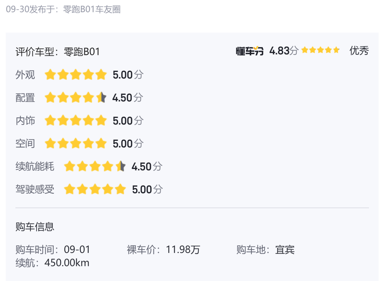 零跑的B01是7月份上市的,到现在也仅仅过去了两个多月,但是八九月的月销量都过万了,9月份甚至有12652辆,不但呈上升趋势,在紧凑型轿车销量排行榜中也占据第9的位置,相当出色。鉴于最早购买B01的朋友已经开了有近5000公里了,那么他们手里头的B01表现究竟如何呢?他们对零跑B01的评价又是什么样的呢?