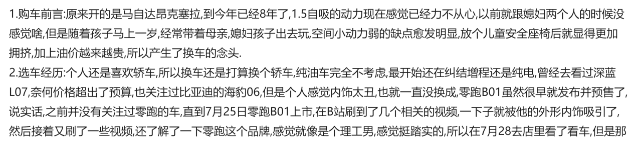 第2位车主来自青岛,能看得出来他非常喜欢零跑的B01。这位车主之前的座驾是马自达的昂克赛拉,马自达不是一个在空间方面很出名的车企,尤其是在国内,但是操控驾驶一直在线。换了零跑B01之后,他觉得B01的空间优势很明显,要比同样是紧凑型轿车的昂克赛拉大上很多。其实仔细看看就会发现,零跑B01的尺寸即便是放在现在也和很多中型轿车差不多大,长宽高分别是4770x1880x1490毫米,轴距也有2735毫米。而且从侧面也能看到,零跑B01把空间尽可能的留给了车厢区域,所以内部的实际空间表现也确实达到了中型车的水准。
