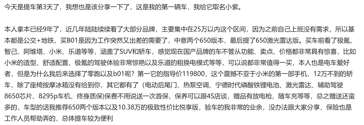 零跑B01之所以能够成功,而且在消费者当中的口碑很高,其实主要是因为厂家在这个理性时代,为消费者提供一辆极其理性的车型。所谓理性非常简单,那就是用更低的价格买到更好的配置,而且还在车辆的机械结构和综合调校方面有所进步,大家想想看,在过去12万的价格可能只会买到屏幕都不带的合资紧凑型燃油轿车。油耗是比国产燃油车低了不少,但整体的享受几乎只有一个车标所带来的小小满足感而已。但在零跑这里,12万你可以买到67.1度的宁德时代大电池,拥有650公里的官标续航里程,这几乎已经等同于燃油车了。