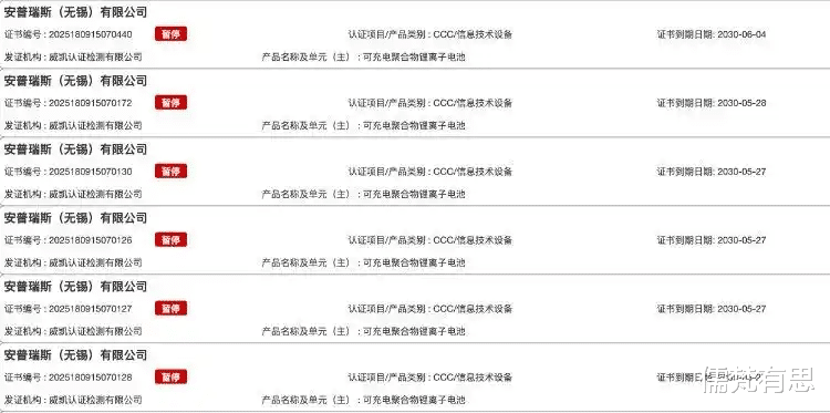 更讽刺的是,这些电芯的供应商安普瑞斯,挂着“3C认证暂停”的牌子还在继续卖货,社交平台上热传的“黑名单表格”里,绿联、倍思等大牌赫然在列,消费者直呼“防不胜防”。