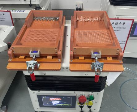 3. 仿形治具的物理裁决 工作台下方集成有定制化的高精度仿形治具板。治具上的每一个型腔,都是根据目标导电片在预设工艺姿态下的三维轮廓进行逆向设计与精密加工而成。