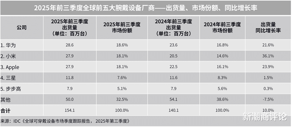 华为再次登顶全球腕戴市场,在华为手环10、WATCH FIT4系列智能手表(WATCH FIT 4、WATCH FIT 4 Pro)、首款鸿蒙AI智能手表WATCH 5系列(42mm和46mm)、 Watch GT 6系列等新品的推动下,2025年前三季度出货量达到2860万台,同比增长21.6%;市场份额达到18.6%,同比增加1.8个百分点。在国内市场,华为以35.5%的份额蝉联第一,出货量达2080万台,同比增长27%。