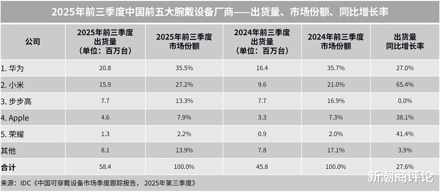 小米表现亮眼,前三季度全球腕戴设备出货量达到2790万台,同比增长36.1%,是TOP5中增长最快的厂商。市场份额也从上年同期的14.6%跃升至18.1%,一方面得益于对入门级市场的精准布局,新推出的小米手环10、首款小尺寸手表小米手表S4 41mm版以及Redmi Watch系列表现出色。另一方面,依托线下渠道深化布局,通过线上线下协同与生态产品捆绑策略,进一步放大市场优势。除了中国市场,其在拉美、东南亚等新兴市场也实现较快增长。