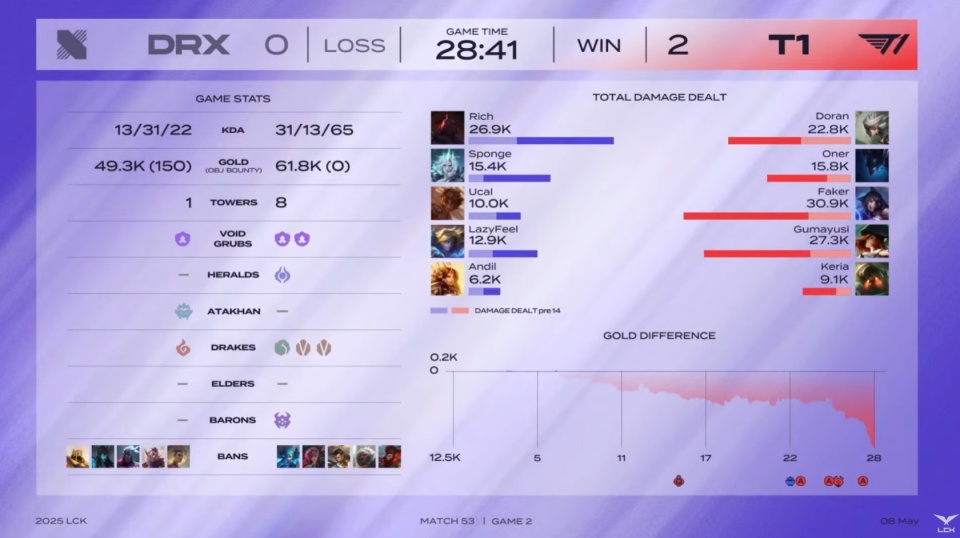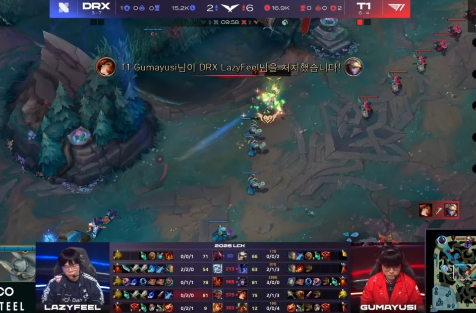 不过T1这边,问题还是有的,尤其是上单Doran的状态,除了玩前排坦克,剩下单带的一些英雄拿出来都很怪!尤其是他第二局拿出的青钢影,要么站出来K队友的头,要么就是在边带过程里被对手抓,毫无团战的画面感!队友们都在秀,就只有Doran在挨打,总是莫名其妙被对手先抓,然后其他队友开始补窟窿,但不得不说,多兰用自己的表现,直接把队友上限拉起来了!