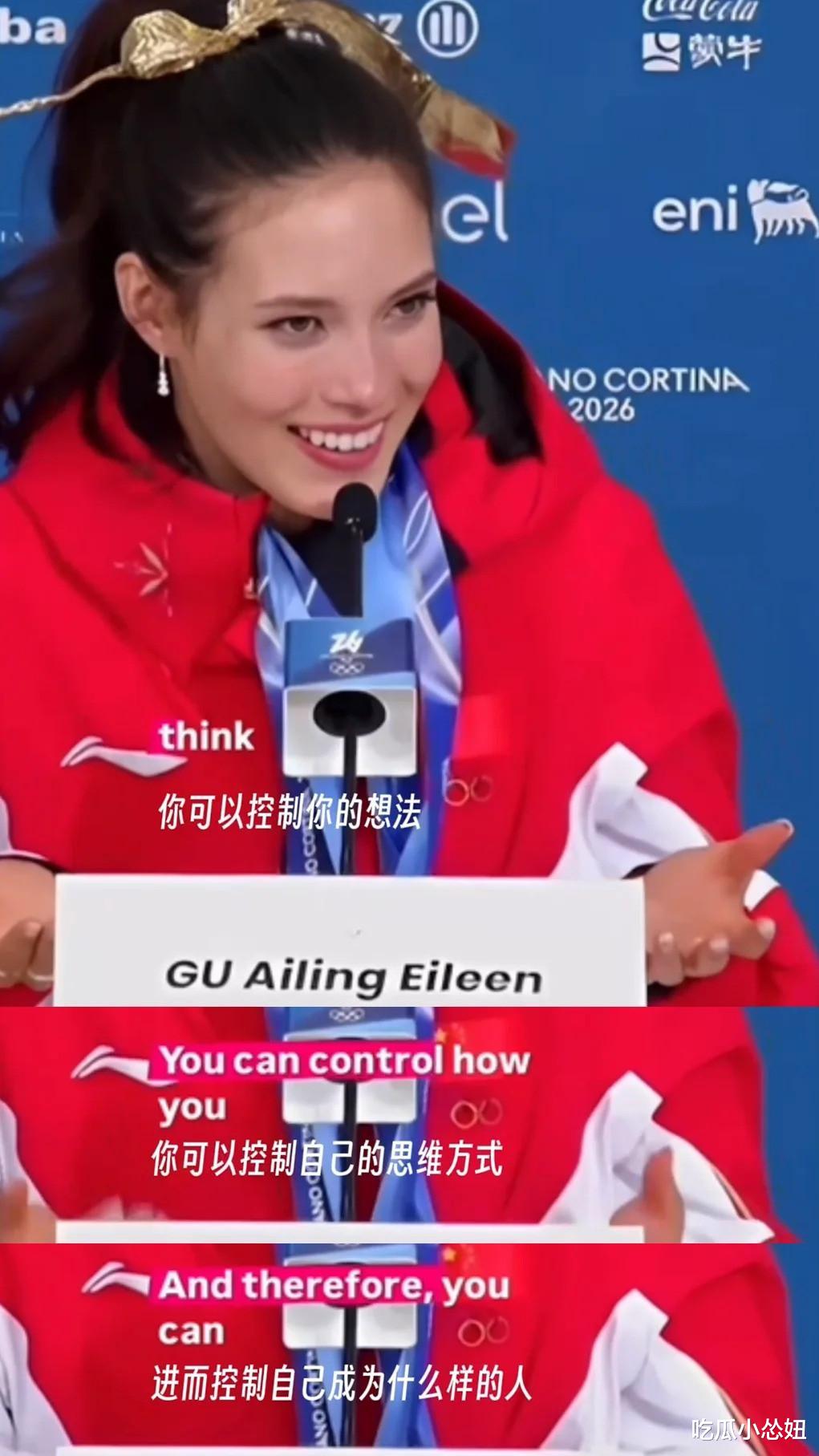 有人问她,大跳台比赛前那么紧张,怎么扛过来的?她说了一句话,特别霸气:今天最重要的一点是,我敢上场。为什么不让世界看到最好的自我?无论输赢,能让世界看到我敢上场,这已经是我的金牌了。