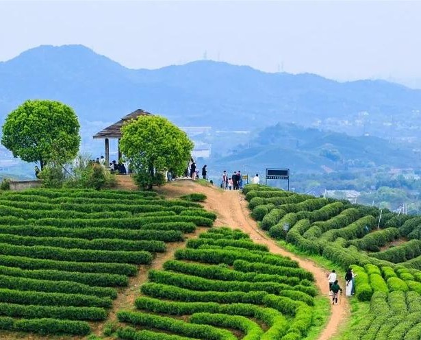 龙坞茶村就是一个世外桃源,无论什么天气和季节,都是一幅水墨画,满山的茶园,中间镶嵌着光明寺水库,水色碧绿,犹如“九寨沟”。沿着茶园的小路一路爬山,可到山顶的休息亭。站在亭子里极目远眺,一派茶园风光无限好!