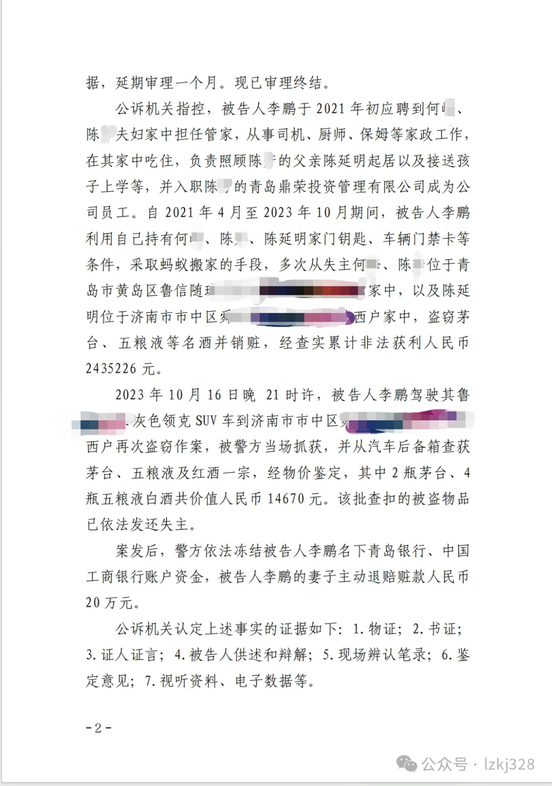 今年9月,山东省青岛市黄岛区人民法院判决了一起刑事案件,案件中,被告人李某在2021年利用给原山东省副省长陈延明及其女儿陈某担任管家,从事司机、厨师、保姆等家政工作,自 2021 年 4 月至 2023 年 10 月期间,利用自己持有失主家门钥匙、车辆门禁卡等条件,采取蚂蚁搬家的手段,多次从失主位于青岛市黄岛区的家中、济南市市中区某号院西户家中,盗窃茅台、五粮液等名酒并销赃,经查实累计非法获利人民币2435226 元。