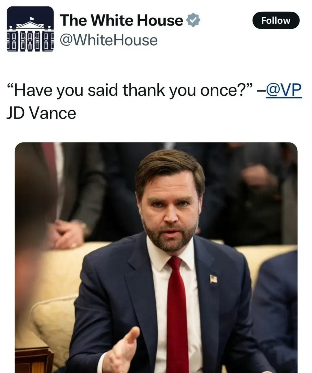 泽连斯基此行是去白宫签署矿产协议,这么说吧,泽连斯基他肯定现在不想签,但他跑过去了,目的是去商量能不能改改内容,特朗普给点承诺,哪怕是虚空飘渺的,签字也不是不能。特朗普态度就是“不改,不管,你赶紧签字”。大家都在聊正事,虽然聊的很抽象,突然万斯出来,不停复读“你为什么不感谢特朗普”。而且最关键的是,就是吵架还没把泽连斯基现场压住。泽连斯基这次说白了就没准备签。但是买卖不成仁义在,谈一次谈不了再谈就是,这本来就很正常。但是万斯硬把话题转到尊不尊重感不感谢最后弄到两边撕破脸了,那后面还怎么谈?