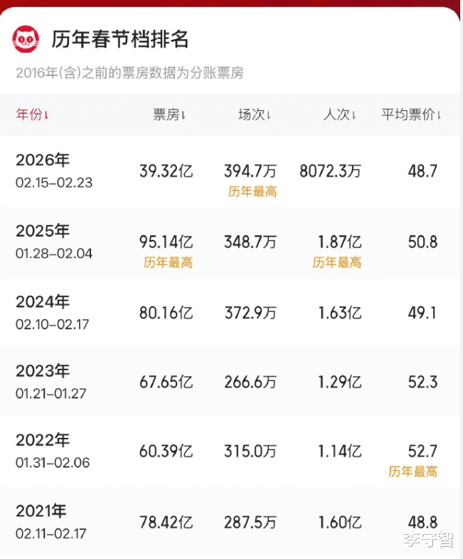 2026年春节档票房才四十亿左右,虽然场次是历年新高,人次却是近年新低,整体不太景气。