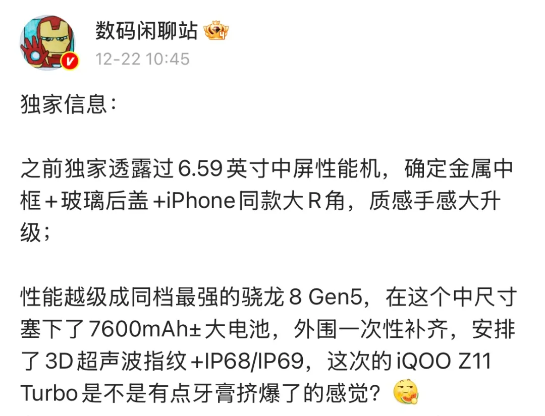 如上图所示,这款手机就是IQOO Z11 Turbo,一款售价会在2000元以内的产品,目前关于这款手机的配置信息已经没有多少悬念,我们一起来看下。首先在机身质感方面,和过去IQOO Z系列的全塑料机身不一样,这一次的IQOO Z11 Turbo不光采用了玻璃后盖,而且还会搭载金属材质的中框,上手质感终于不差了,这便是它提升最大的方面了。长期以来,在2000以内的手机中,绝大部分的手机采用的都是塑料材质的中框,近2年也只出现了Redmi Turbo 4 Pro这一款搭载了金属中框的千元机,如今的IQOO终于也加入了这个阵营,只能说国内的千元机市场也“太卷了”!