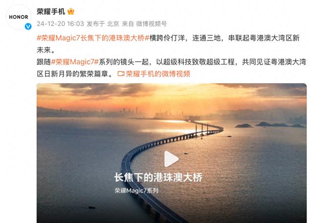 12月20日,澳门回归祖国25周年之际,荣耀发布了一段以长焦下的港珠澳大桥为主题的视频大片,以长焦镜头拍摄记录了港珠澳大桥及三地城市地标,展现了荣耀Magic7系列在影像技术上的突破与实力。据悉,荣耀将于12月23日正式举行荣耀Magic7 RSR保时捷设计及影像技术发布会。