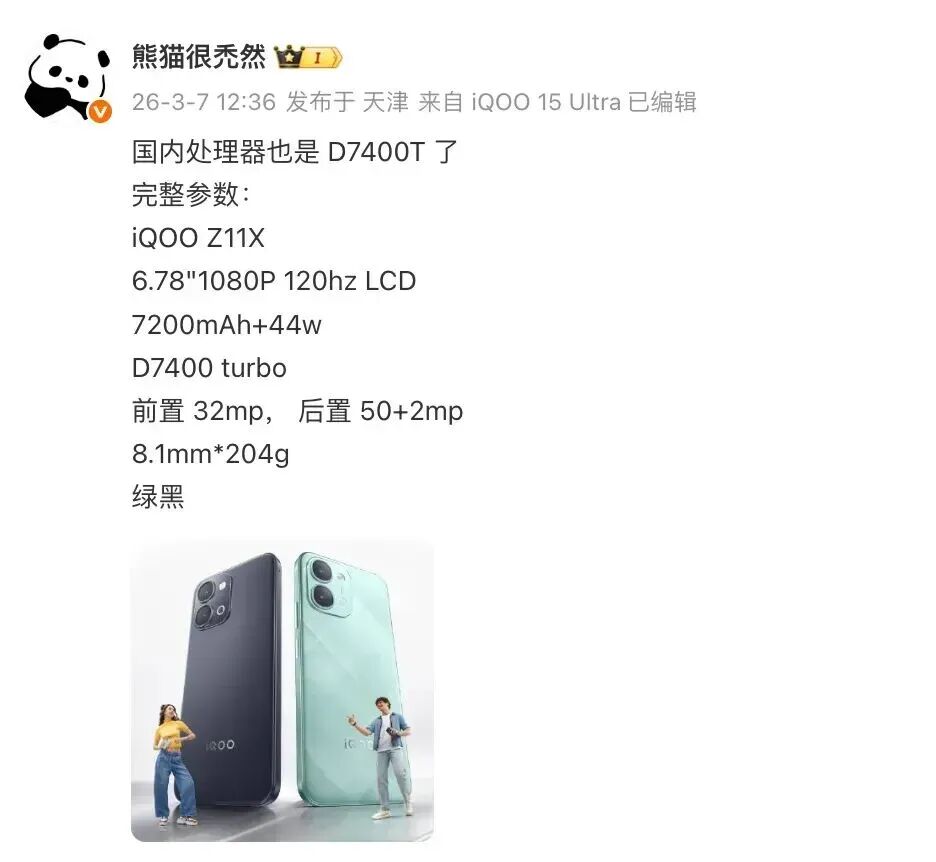 在此之前,同一位博主的爆料还显示,iQOO Z11X将配备一块6.78"1080P 120hz LCD屏幕,内置7200mAh电池,支持44w快充,核心搭载天玑 7400 Turbo芯片,前置 3200万像素自拍镜头,后置 5000万像素主摄和200万像素镜头组合,机身厚8.1mm,重204g,提供绿、黑两款配色。