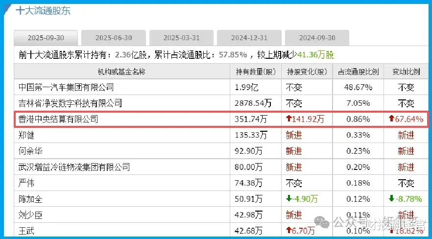 但蹊跷的是,代表北向资金的香港中央结算有限公司,却在三季度大举加仓,增持比例高达68%。