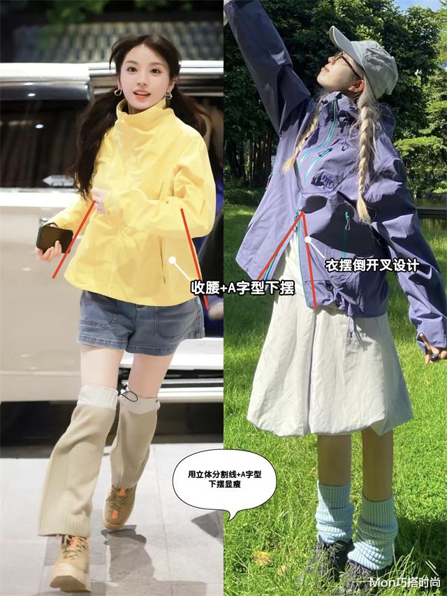 用立体分割线+A字型下摆的思路也很适合梨型、胖H型身材的姐妹遮肉。也可借助冲锋衣衣摆的倒A型开叉+宽松下装显瘦。