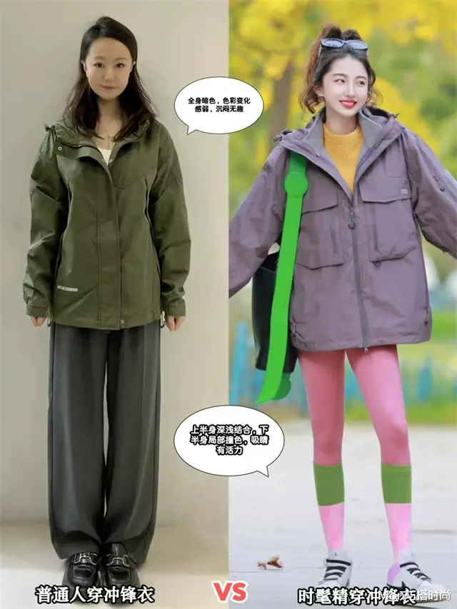 看对比就会发现,当暗色布满全身,就会加重冲锋衣的繁琐感。不妨换个思路,外深内浅搭配,在配饰或下半身局部撞色,显瘦又活力四射。