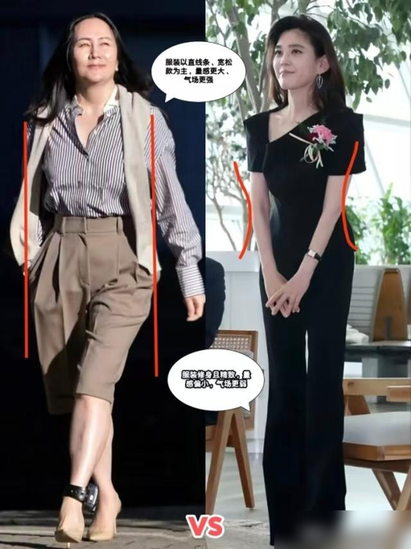 骨架大、方脸的姐妹学孟晚舟,穿直线条、宽松款;骨架小、脸型柔的学李富真改良版,选柔中带刚的剪裁,少穿高领或全身紧身款。