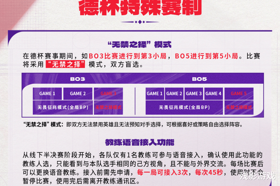 在LCK那边官宣将试点“教练语音”之后,LPL也是随之官宣,德杯从线下半决赛开始,也将启用“教练语音”机制。只不过LPL这边只允许一名教练参加,教练的视角是和己方队员一致的,非上帝视角。其次,教练也无法和外界进行交流,每场比赛过后,允许更换语音教练,但需要提前打申请。而每一局比赛,教练可以自由接入3次,每次的接入时间为45秒,接入时不会暂停比赛。