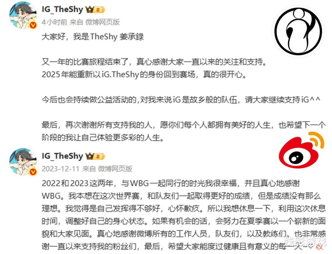 在转会期的最后一天,IG发布了选手的官宣信息,其中,Wei、Rookie和Meiko都选择了续约,只有Theshy被官宣了“暂离赛场”。而Theshy本人也是随之发布了一篇短文,虽说看着是确定自己将要休息,但字里行间的说法却和WBG时期的休赛不同。在WBG说的是有机会会以崭新的面貌和大家见面,也就是为回归留了个说法。但此次却没有说任何重回赛场的信息,还提到了“希望下一个阶段”。