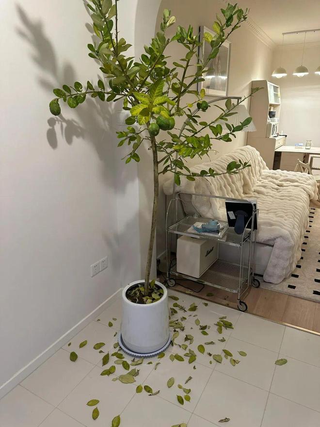 网友@快乐小屋:我入手的这盆柠檬树才一周时间,果子就开始干瘪了,也不知道咋回事。更关键的是,它每天都会掉叶,现在已经决定摆烂了,等它真正枯死就扔掉。