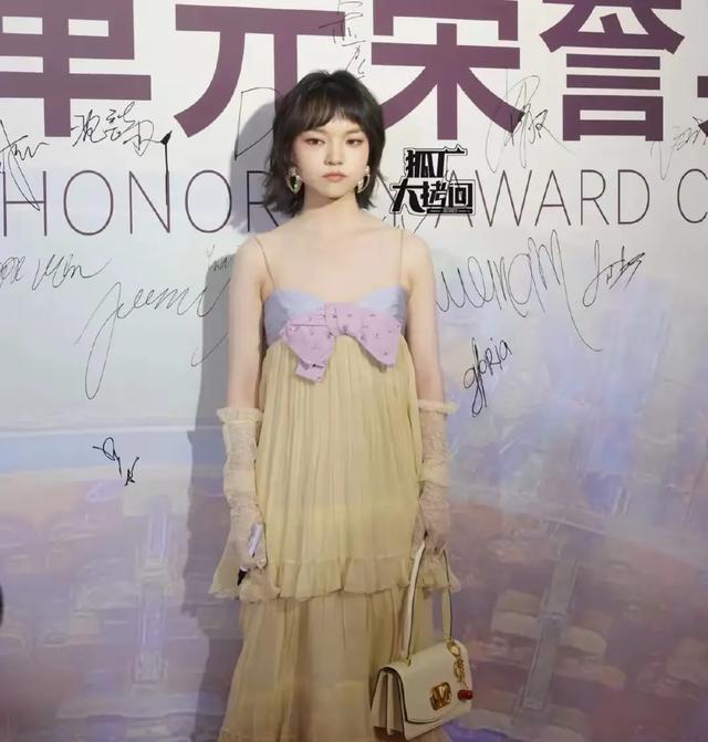 这个在《向阳花》里演活黑妹的新人演员,穿着与自身气质南辕北辙的糖果色吊带裙,手足无措得像误闯成人酒会的初中女生。