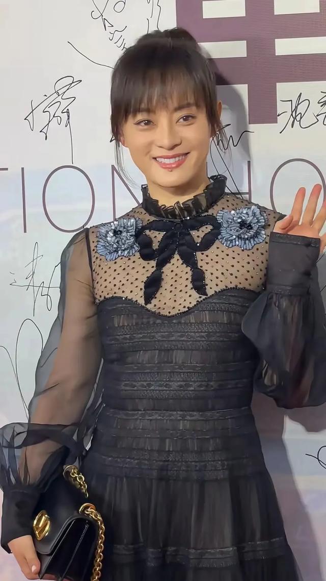 黑色薄纱长裙上突兀的靛蓝刺绣牡丹,搭配小学生夏令营般的平刘海,生生把《甄嬛传》里走出来的娘娘打回县文化馆汇报演出现场。