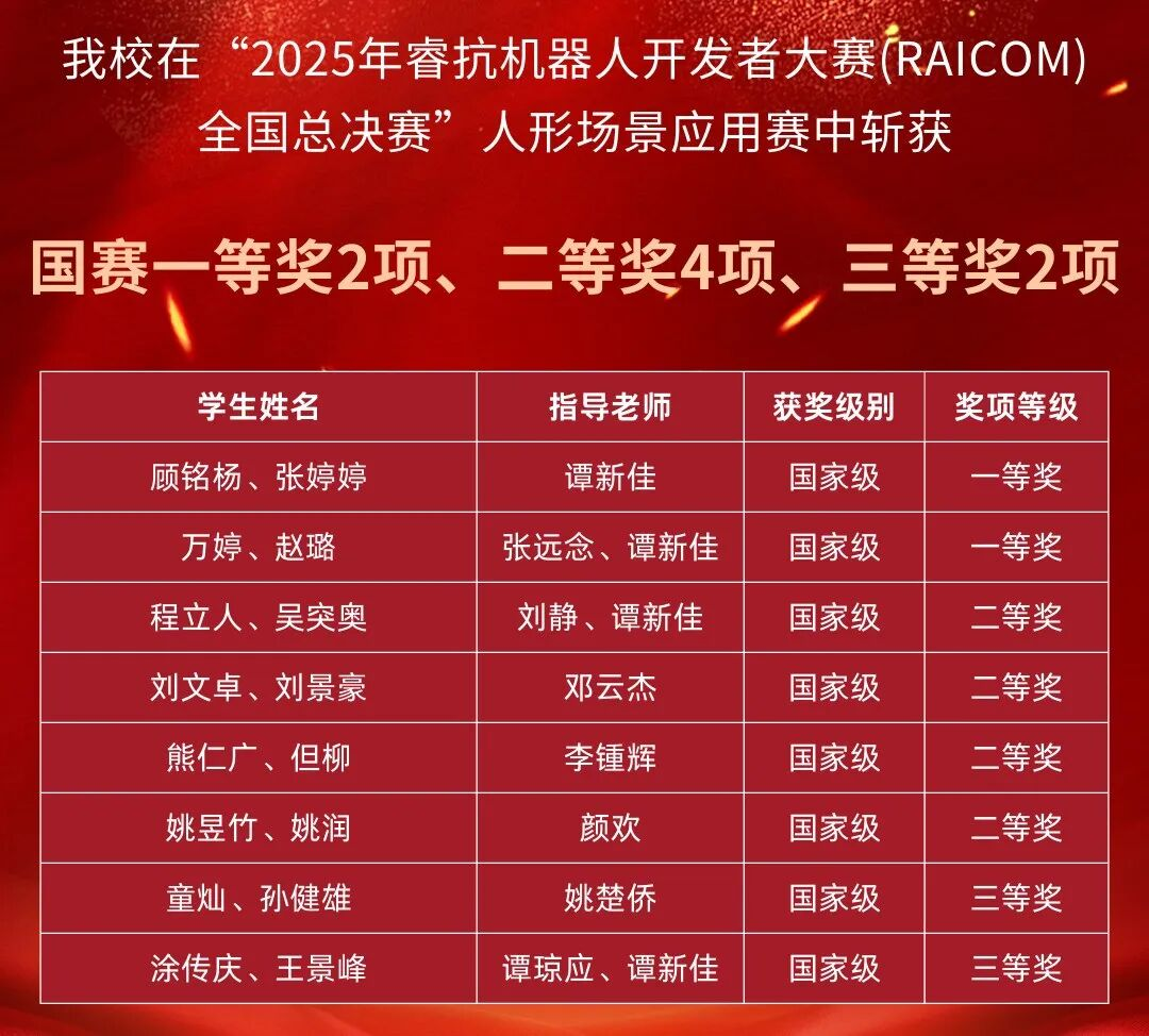 近日,2025年睿抗机器人开发者大赛(RAICOM)全国总决赛人形场景应用赛圆满落幕。湖北恩施学院参赛团队在全国多所高校的激烈角逐中脱颖而出,一举斩获国家级一等奖2项、二等奖4项、三等奖2项,共计8项国家级大奖。这一亮眼成绩既是学校“以父母之心育人,帮助学生成就梦想”办学宗旨的生动践行,更是“立德树人,因材施教,学以致用”教育理念与“正德至善、为学至精”校训精神的鲜活印证,充分彰显了学校高质量应用型人才培养的扎实成效。