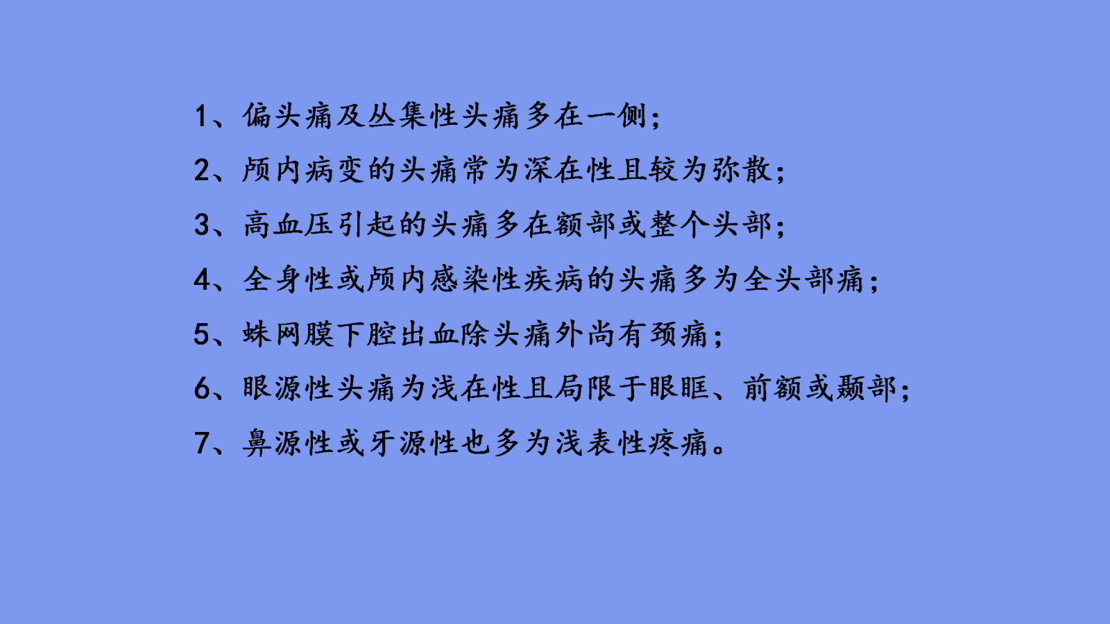 3、鼻窦炎:鼻窦发生炎症时,会引起鼻窦内压力升高,导致头痛。疼痛部位与受累的鼻窦有关,比如额窦炎引起的头痛多在额头部位,上颌窦炎的头痛多在面颊部,且疼痛有一定的时间规律,晨起时较轻,午后加重。