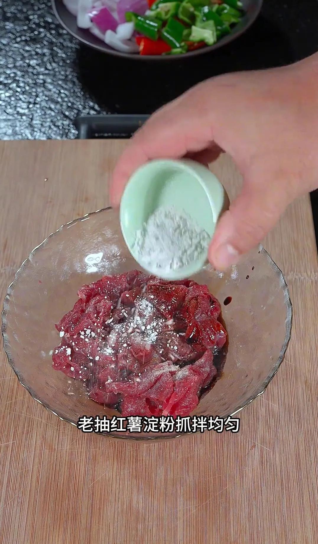 紧接着再加入一些淀粉抓匀,最后淋上一点油,可以锁住水分,让牛肉腌得透、嫩度刚好。