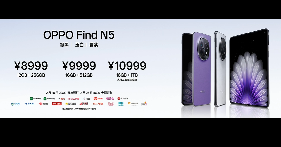 相信在OPPO的推动下,Find N5应该能引领一波折叠屏手机的新潮流,新机将于2月26日正式开售,12+256GB是8999元起,感兴趣的可以了解下。
