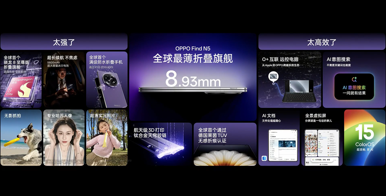 “钛薄了,太强了,太高效了!”这是这次新机的真实写照,8.93mm的折叠厚度,直接登顶全球最薄折叠旗舰宝座,甚至比大部分直板机都要轻薄,用张老板的话说就是“薄到没折”。而且,这次Find N5的折痕控制还非常浅,并且通过了德国莱茵 TUV 无感折痕认证,真正是做到了“浅折痕,看OPPO”啊!