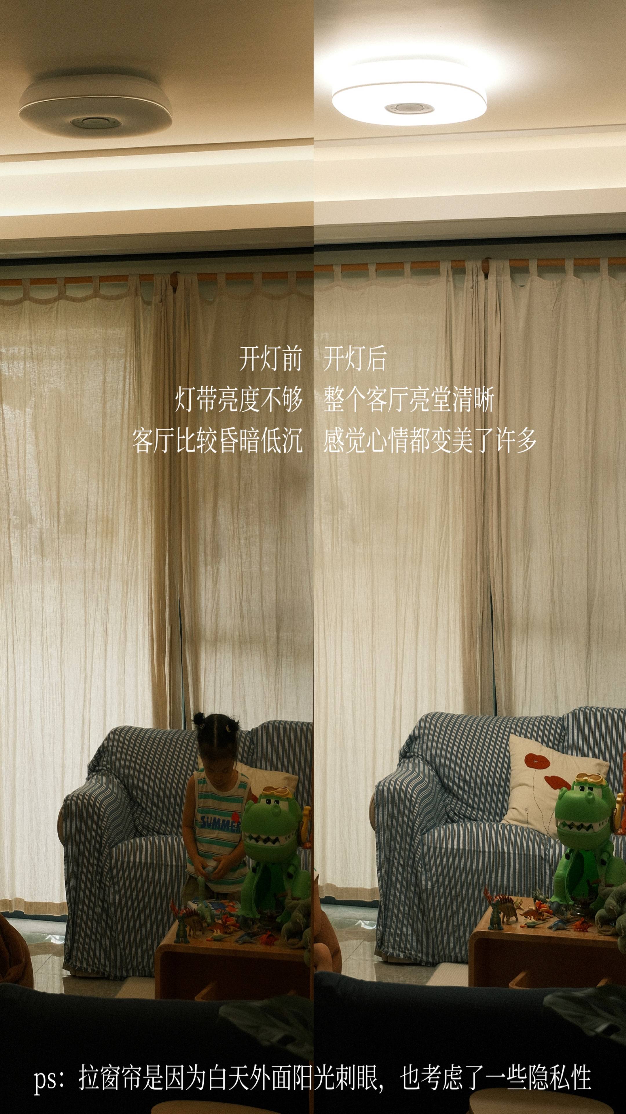 周末家庭影院时间,Aora化身光影魔术师。12302lm的整灯光通量覆盖25㎡客厅,45°控光灯罩让吊灯般的璀璨感与吸顶灯的简洁完美平衡。当色温从5300K的日光切换至2700K的黄昏,爸爸的咖啡杯倒映着暖光,朵朵在地毯上追逐光斑,仿佛整个家都在呼吸。