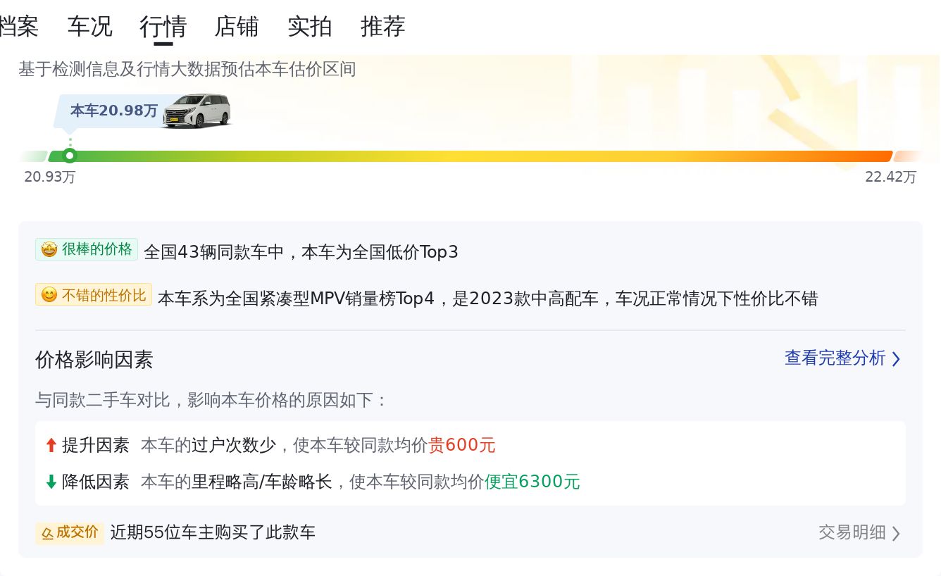 二手车的售价受到很多综合因素的影响,包括车辆的使用年限、行驶里程、保养情况等,因此实际车况是影响成交价格的决定性要素。根据懂车帝平台的数据,这辆车的市场行情大约在17.08万至20.57万之间。具体售价因车况而异。这辆车目前的售价为20.98万,考虑到其车况表现,这个价格还是比较合理的。