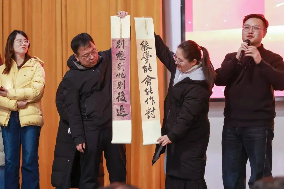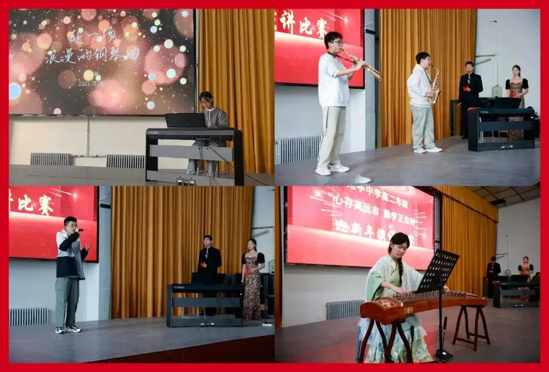 本次活动,高二年级精心策划,在各个环节作了周到细致的安排。比赛的18位参赛选手由各班初赛选拔产生,评委由年级胡春青等10位语文老师组成。活动由2401班郝栋煊和2409班史靖琳同学主持。参赛作品内容健康、积极向上,充满青春正能量。选手们自备了视频背景及背景音乐,选用真实学习情境的图片,采用“朗诵+舞蹈”、“朗诵+乐器”、“朗诵+与观众互动”等多种形式,突破了传统朗诵比赛模式。比赛期间,师生们还进行了唱歌、弹钢琴、弹古筝,吹萨克斯、器乐合奏等表演,活动丰富多彩,别开生面,现场气氛热烈,令人耳目一新。18位班主任老师具有学科特色的新年寄语中,白锦懋老师书写的对联、郗磊和赵梓良祝福励志的歌曲、左仲鸣老师带领2408班同学齐唱班歌《中国军魂》等深深地感染着在场的每位观众,将演讲赛气氛推向高潮。最后,评出一等奖1名,二等奖3名,三等奖5名,优秀奖9名,校长杨志勇、纪委书记李永强、校委委员刘彩萍,年级主任及语文老师们为获奖选手颁发了荣誉证书和纪念品。