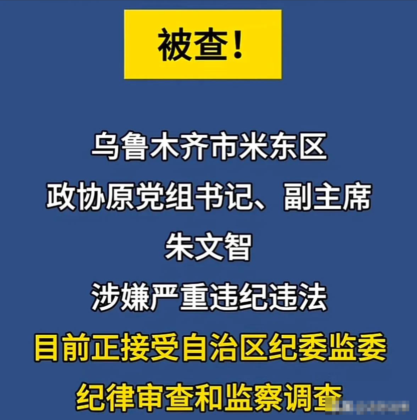 2025年5月9日消息,据新疆维吾尔自治区纪委监委消息:新疆维吾尔自治区乌鲁木齐市米东区政协原党组书记、副主席朱文智涉嫌严重违纪违法,目前正接受新疆维吾尔自治区纪委监委纪律审查和监察调查。
