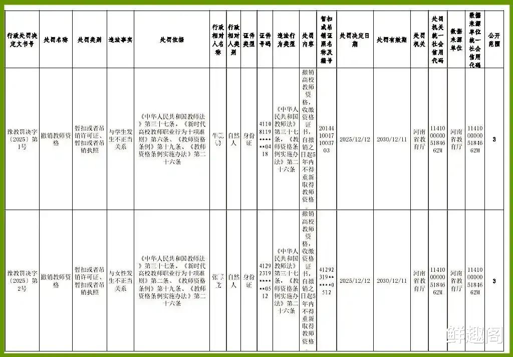 2026年1月中旬,有网友曝光了一起关于师德方面的事件。据了解,这件事情源于2025年12月31日,河南教育厅发布的《2025年撤销高校教师资格行政处罚》通报。这份通报中明确指出,对省内5名高校教师作出资格撤销处理,其中3个人因为触犯刑法被终身剥夺教师资格;另外2人因为违反师德师风被撤销教师资格,并且5年内不得重新申请认定。