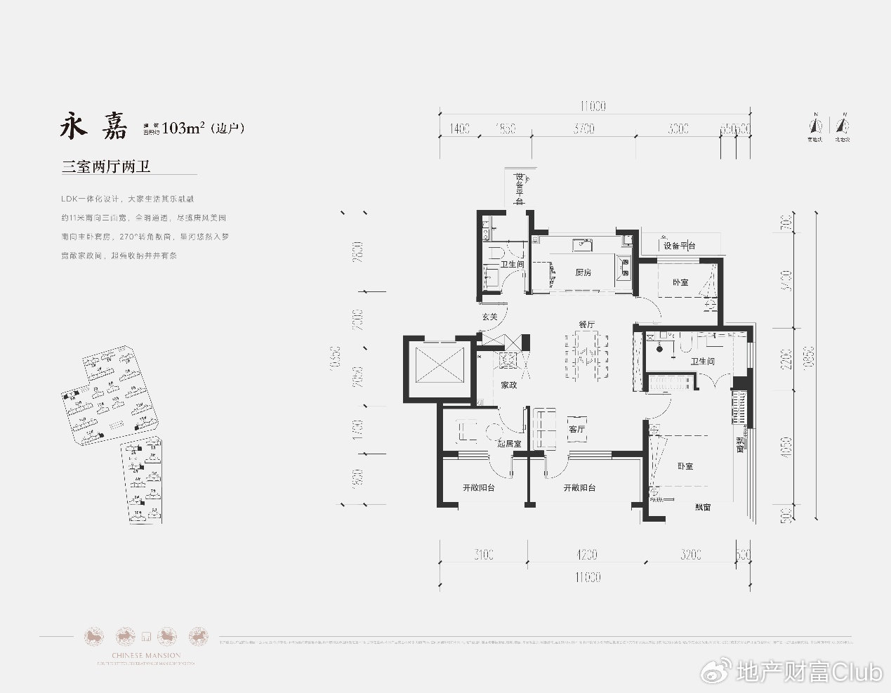 如建面约103㎡朗阔三居,约11米南向面宽,通风采光更佳;LDK一体化设计,打造约4.2米客厅,全景落地窗开阔视野;配置罕见独立家政间,提升家的整洁与秩序。约3.7米面宽主卧套房,面积高达约22.5㎡,市场罕见270°转角飘窗,主卫还配置L型梳妆台,超大镜柜,升维居住品质。